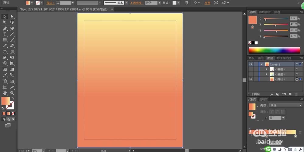 1、画出图片的背景路径,我们用火红色到灰色的渐变填充,让上方为灰色,下方为火红色。