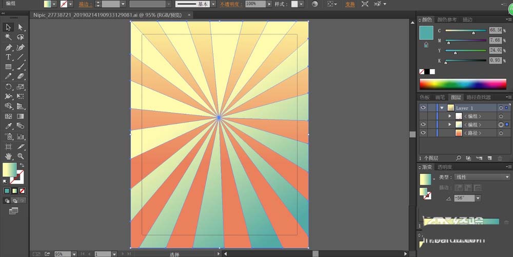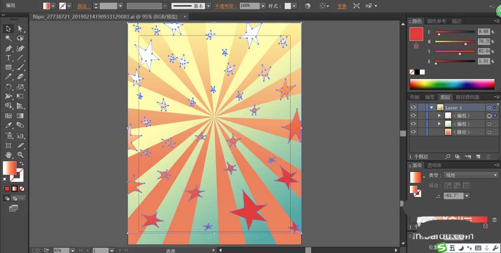 2、继续使用钢笔工具画出放射形状的三角形路径,我们用蓝黄色的渐变填充,让中心为黄色,周围为蓝色。接着,我们在图片中画出大小不同的星星,星星统一填充红白色的渐变。