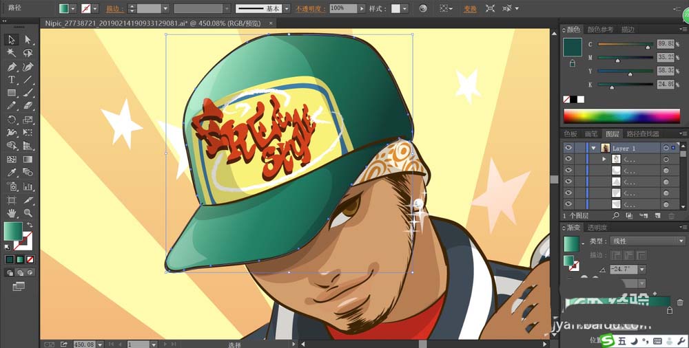 3、这一步开始,我们绘制人物的形象,先用钢笔画出男生的帽子,我们用青绿色的渐变填充,帽子上面的图文用红黄色分别填充。男生的脸蛋用粉色填充,暗光区域为暗粉色填充。