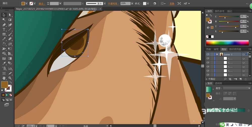 4、男生的眼晴用黄棕色与棕色搭配填充,眼晴上方的帽子的阴影用正片叠底的灰色填充,透明度设置成90%。男生的耳朵下方用白色的星星装饰,星星设置成不同的透明度,让层次感觉出来。