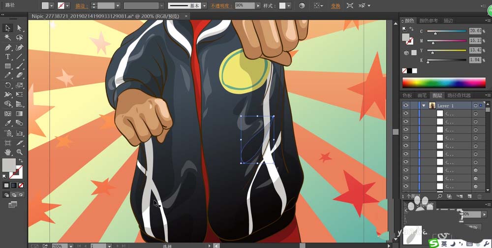 5、用藏青色的渐变填充外衣,暗光区域也用正片叠底的灰色填充,透明度设置成90%。高光区域用20%左右透明度的白色填充,衣服上面的标签用黄色与绿色搭配填充。