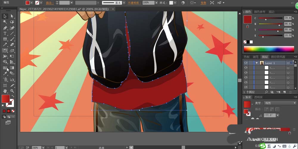 6、男生的衬衫用红色的渐变填充,阴影区域的填充方法与前面一样。