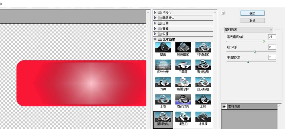 7、为了让瓶子更加的真实,我们可以使用效果当中艺术效果,塑料包装这个滤镜,从而让瓶盖子与瓶身更加的质感,瓶身做了一个透明度为50%的设置。瓶子简笔画设计完成。