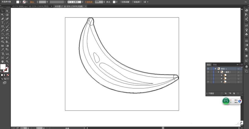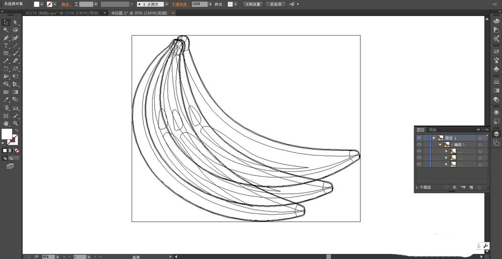 2、画出香蕉的暗光区域路径与高光路径,再用同样的办法画出一串香蕉的基本轮廓路径。