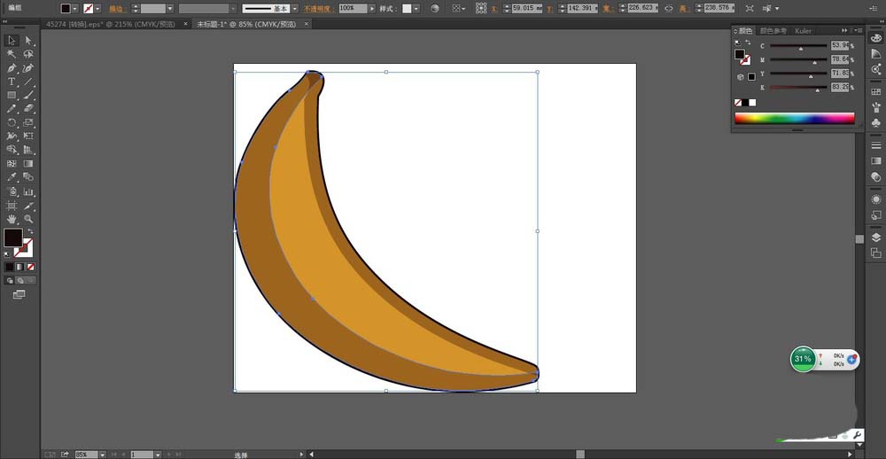 4、继续用暗茶色填充香蕉的边缘暗光区域,让香蕉的表面的色彩有着明显的过渡。