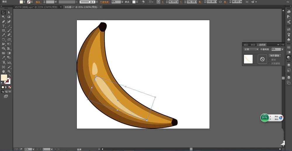 5、这一步画出香蕉的高光区域路径,我们用半透明的黄色填充。在香蕉的两端,我们用黑色填充结头路径。