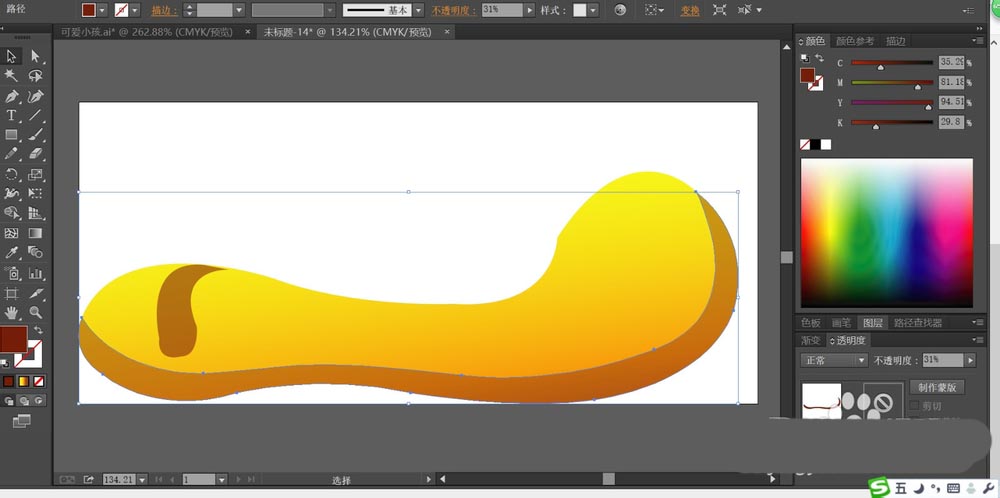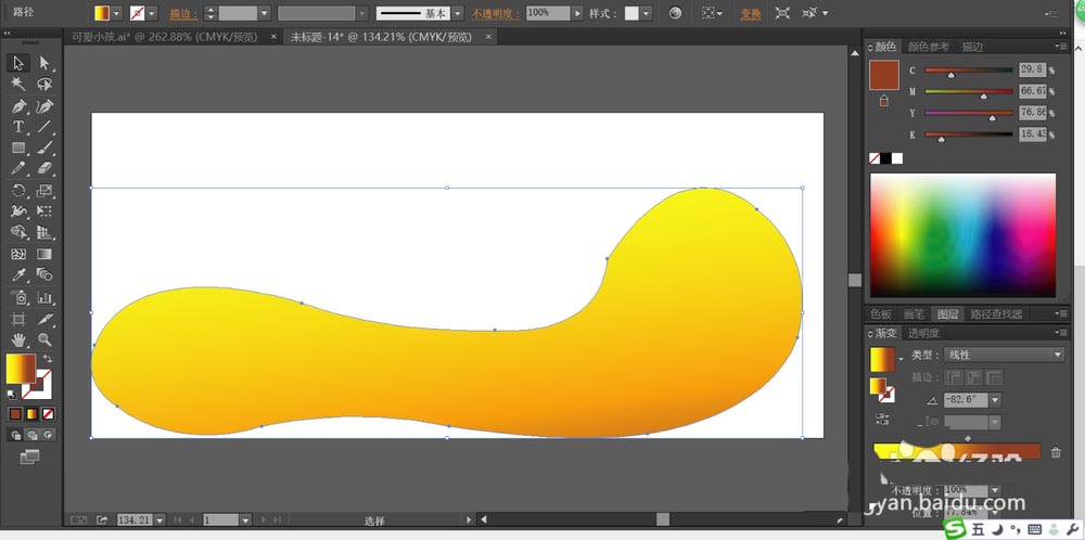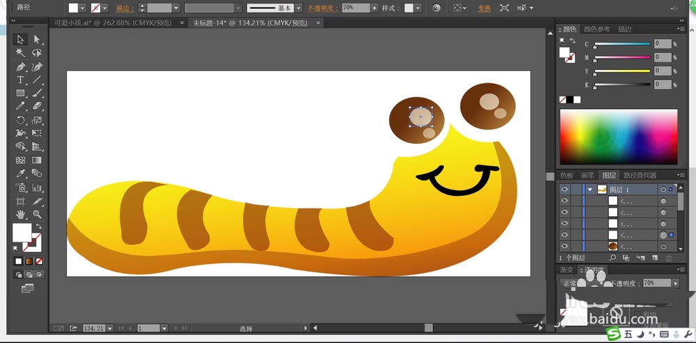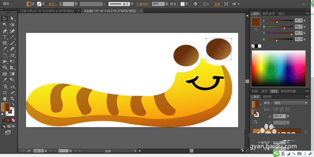 1、先用钢笔画出毛毛虫的基本轮廓,我们用橙色的渐变填充整个毛毛虫的身体路径,让高光在左上,暗光在右下。