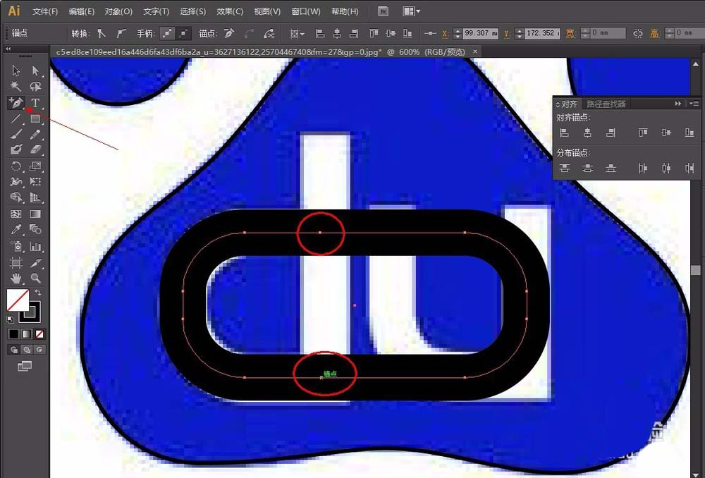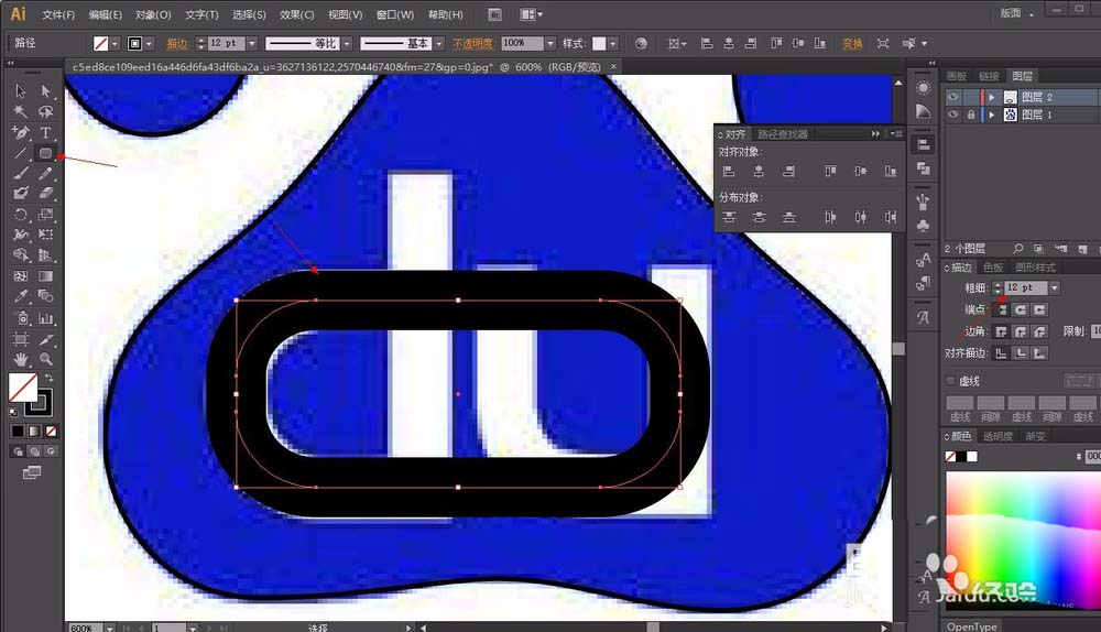 3、使用圆角矩形工具(方向键调整角的大小)画出圆调整描边大小,再用添加描点工具,在矩形上添加描点,再用直接选择工具把不需要的点删除,用钢笔工具勾出竖线,同样方法画出(u)。操作如图: