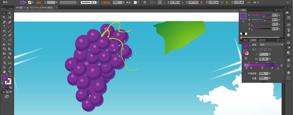 5、使用圆形工具画出葡萄的圆球并复制成葡萄串的样子,我们设置一个紫色的渐变填充这个圆球形,用绿色的渐变填充绿叶的路径。