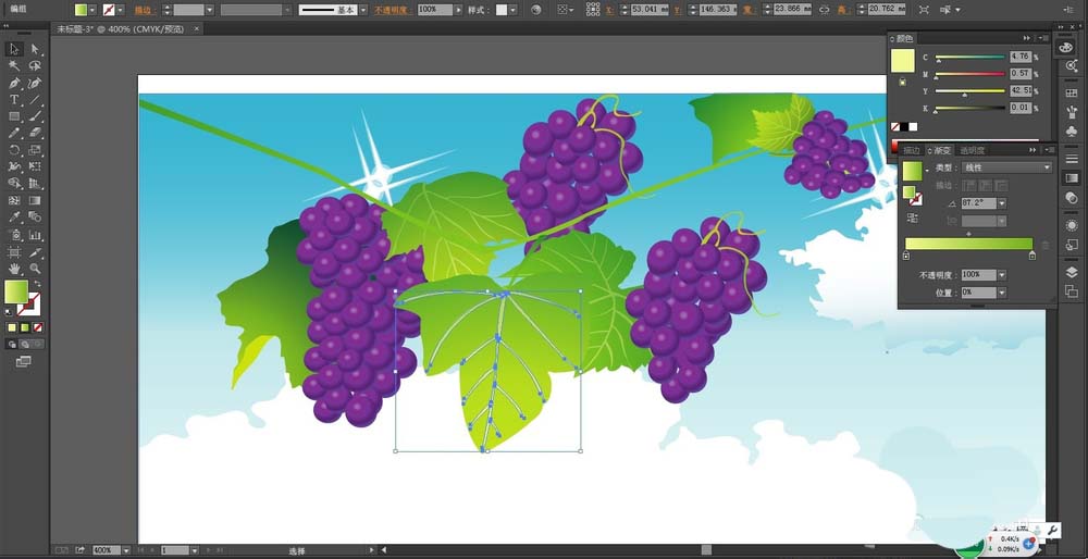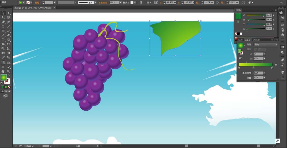 6、绘制更多的绿叶路径到葡萄的中间,我们用不同的绿色渐变填充。