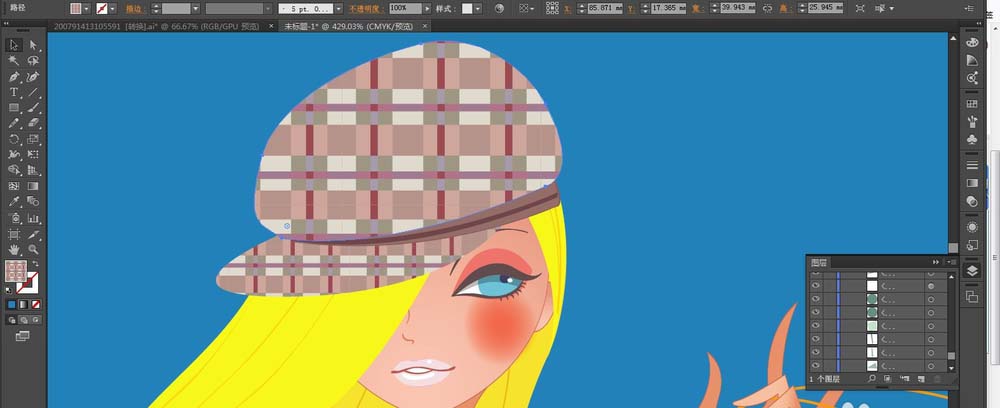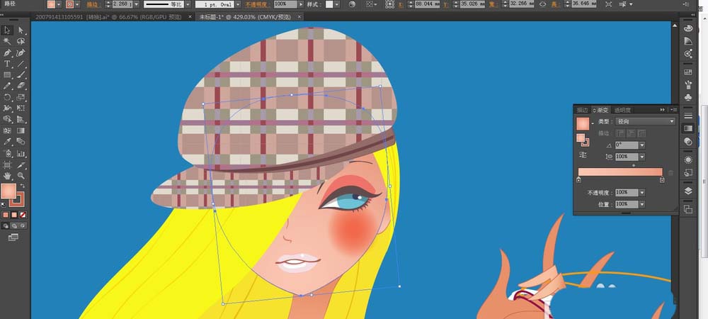2、我们用选定的花纹填充帽子所在的路径,用粉色的渐变填充女孩的脸蛋。