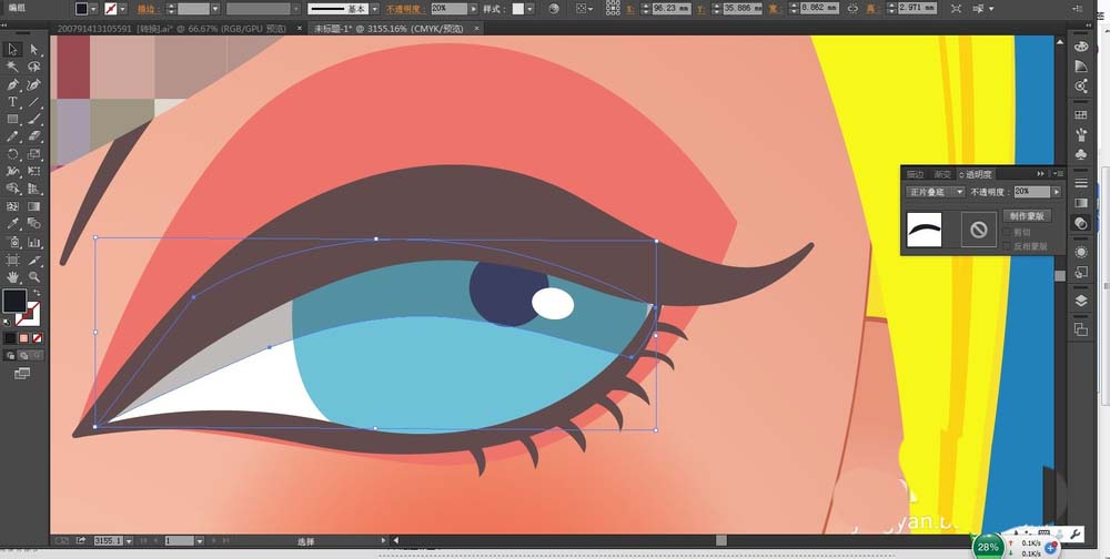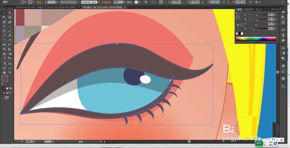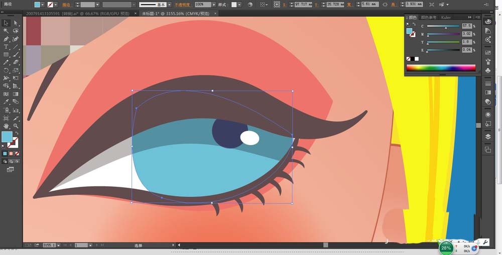 4、这一步,我们用天蓝色与深蓝色搭配填充女孩的眼珠,用咖啡色与砖红色搭配填充女孩的睫毛与眼影的路径,用白色填充眼白与眼晴上面的高光区域。