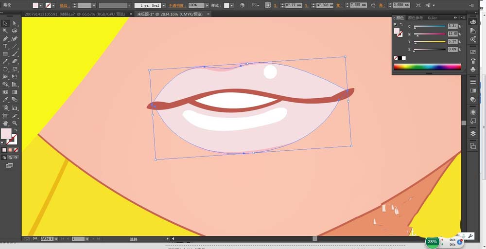 5、使用淡粉色填充女孩的嘴唇,用暗红色与白色填充女孩嘴唇中间的暗光区域与牙齿。