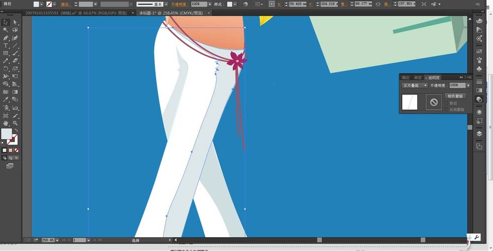 8、用白色填充女孩的长裤的路径,用正片叠底的灰黑色填充长裤的暗光区域路径。用暗红色填充女孩腰间的花瓣腰带的路径。