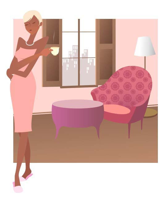 10、用淡黄色填充女子的头发,用深咖啡色填充女子的表情元素,用品红色填充女子的鞋子的路径,完成居家生活场景画设计。