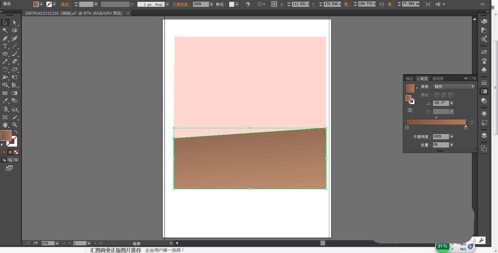 1、先用矩形工具画出大小两个矩形分布在图片的上方与下方的位置,我们填充上方的矩形为粉红色、下方的矩形为咖啡色的渐变。
