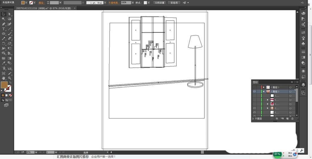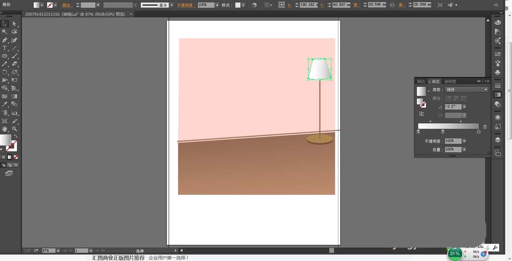 2、继续用钢笔画出图片右侧的一盏台灯的路径,我们用灰白色的渐变填充灯罩的路径,再用不同明度的咖啡色填充灯的底座的路径。