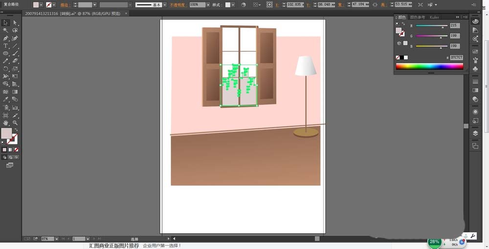 4、我们用咖啡色的渐变填充窗户的玻璃与边框的路径,再用红灰色填充窗户中的剪影的路径,色调淡一些,就像远处的景物。