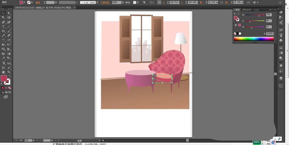 6、继续画出圆桌旁边的一张大大的沙发的路径,我们用糯红色的渐变填充这张大大的沙发的正面与侧面,让侧面的色调较暗。