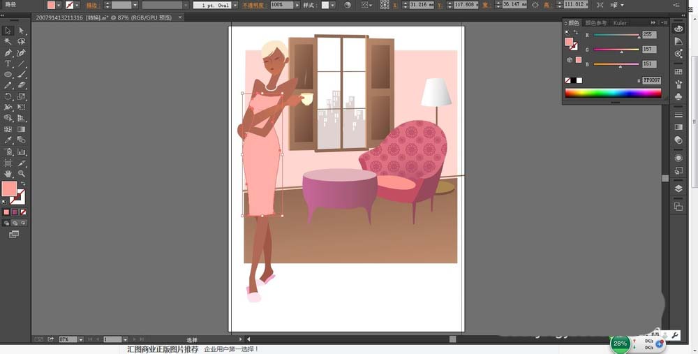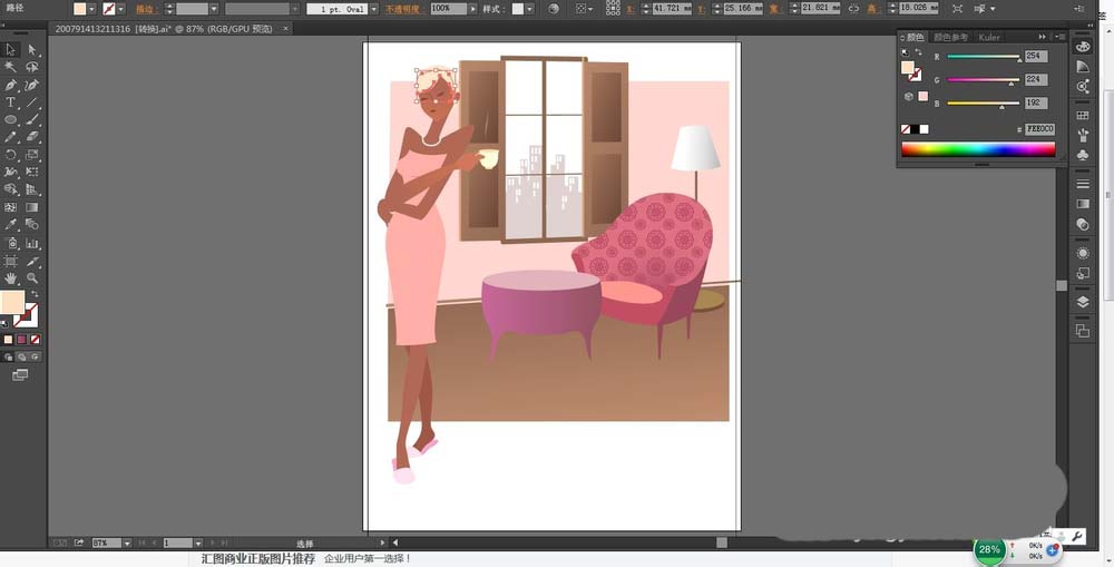 9、我们用咖啡色与淡粉红色的渐变填充女子的身体与服饰的路径。
