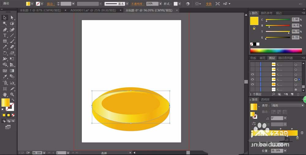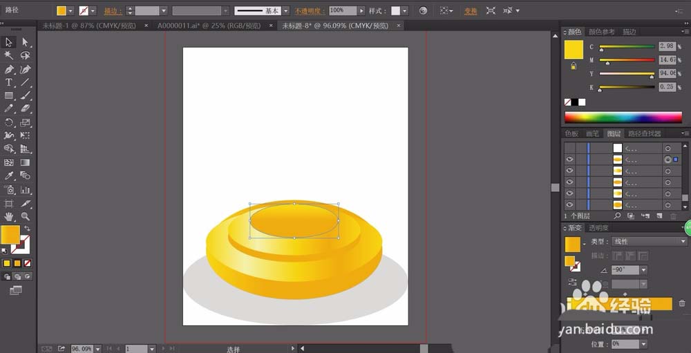 2、继续复制一下这个路径,我们缩小一下右侧的路径并填充亮橙色的渐变。从而让基座的质感呈现出来。做好一层之后,再用同样的方法制作更小的第二层。