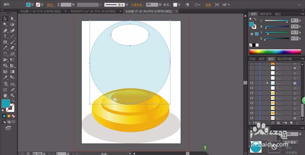 4、画出一个大的圆形作为基座的阴影所在,我们填充灰色并设置透明度为30%,继续用圆形画出玩具上方的大的圆形,我们填充一个淡蓝色,我们设置成为30%的透明度,高光用白色填充。