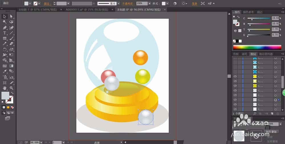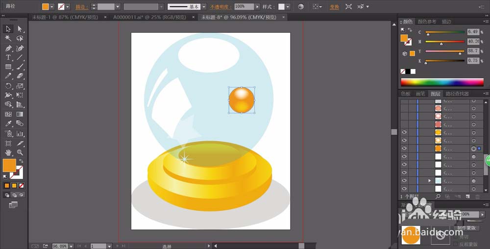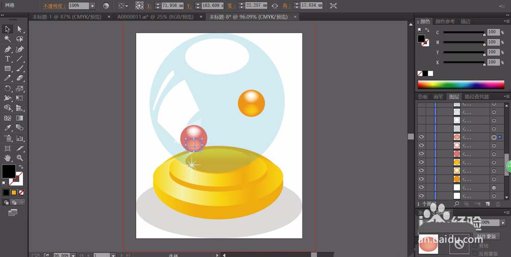 5、这一步开始制作玩具内的小球,我们用圆形工具画出第一个小球的路径并用橙色填充,我们在高光区域用网格渐变填充,从而让白色到橙色的渐变呈现在高光区域。两个高光区域在色调上有所不同。