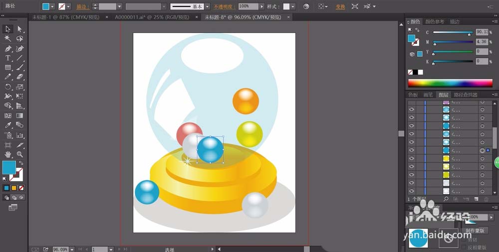7、继续绘制出蓝色的小圆球与淡绿色的小圆球。