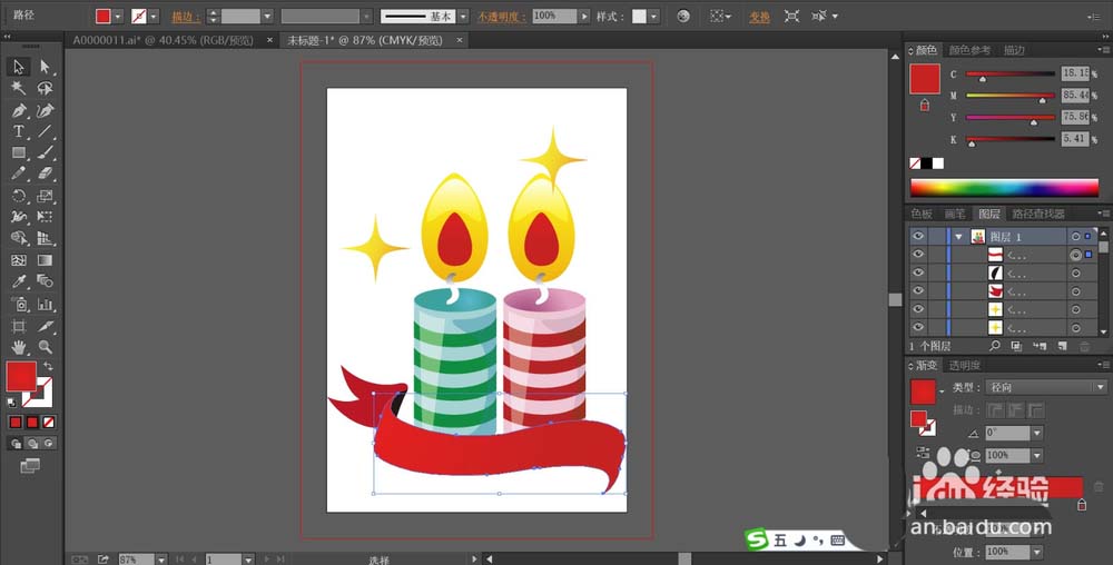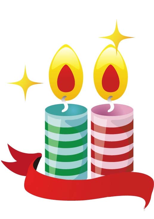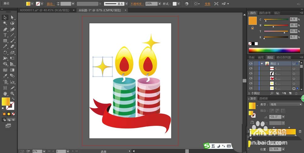 7、最后,我们用钢笔画出彩烛的飘带,我们用红色的渐变填充这个飘带,再用星星工具画出星星并填充一个橙色的渐变,完成彩烛图片设计。