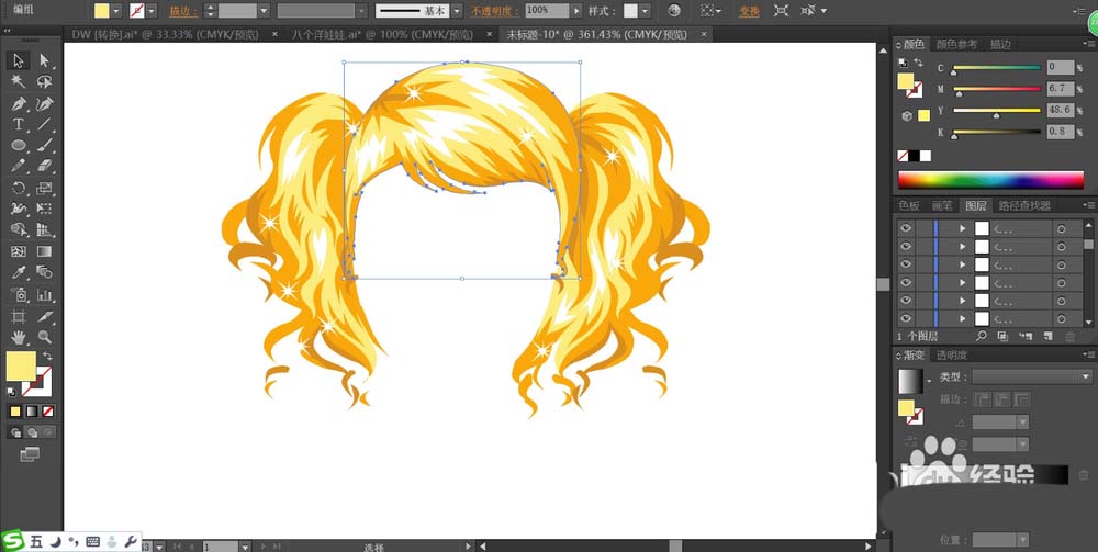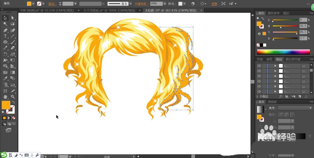 2、我们用橙色、黄色、白色三种颜色分别填充高光、中间、暗光区域,让金色的头发效果呈现出来。