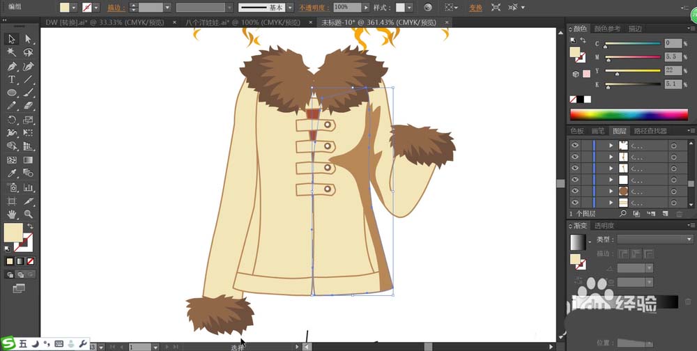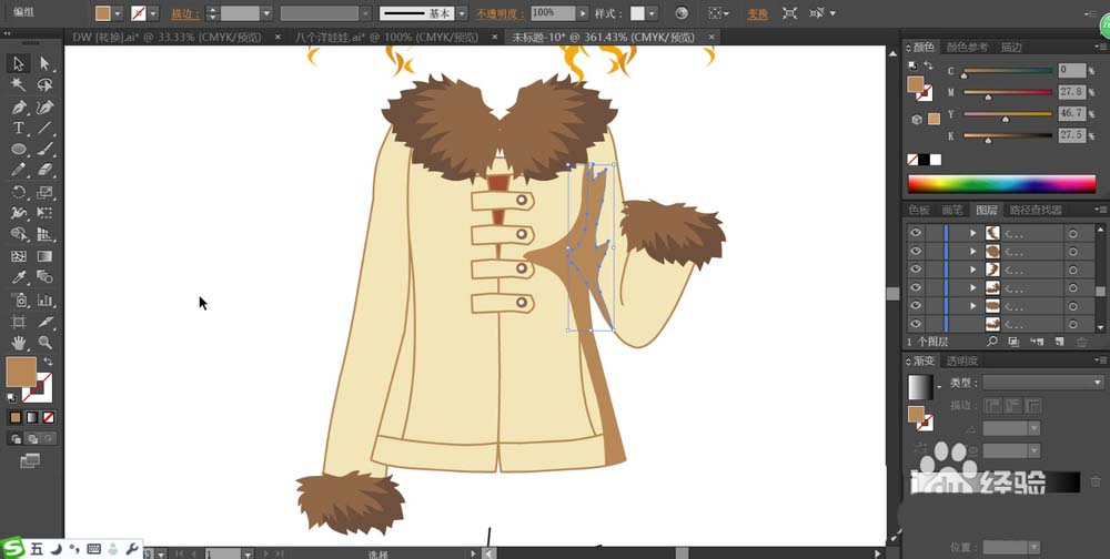 4、我们用不同明度的咖啡色与米黄色来搭配填充毛领、袖口还有上衣的主体区域,暗光区域设计在上衣的右侧,我们用淡咖啡色填充。
