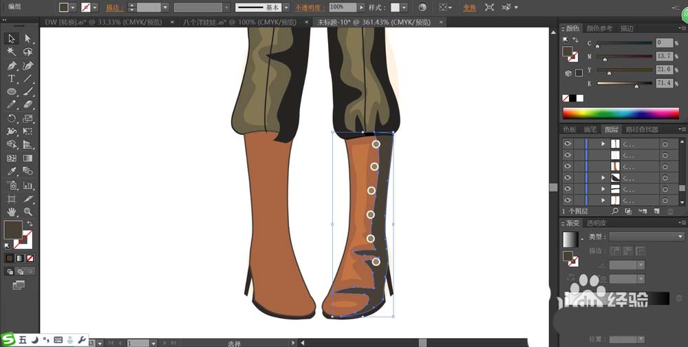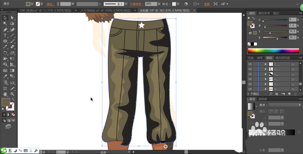 5、继续画出女生的长裤,我们用不同明度的茶色来填充长裤上面的高光与暗区路径,让暗光呈现在裤子的右侧边缘。