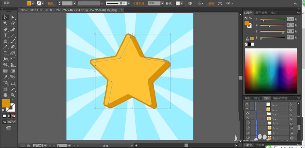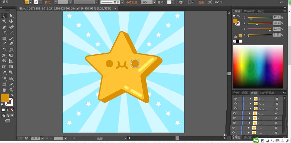 6、使用钢笔画出星星的表情路径,我们用暗金色填充这个表情,完成星星背景设计。