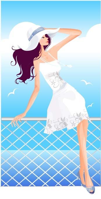 7、绘制出女子的大帽子的路径,我们用灰白色与蓝色搭配填充帽子的主体与修饰彩带。