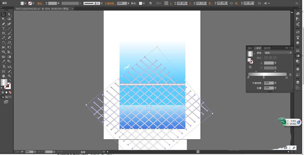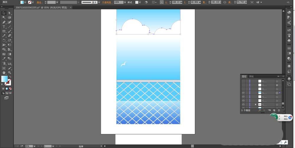 3、我们用矩形与栏杆元素做一下剪切蒙版的效果,从而让栏杆收入到画面当中,再事出一个蓝色的天空,让白云部分截去,从而形成一个完整的蓝色的天空与白云。