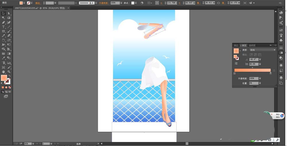4、这一步,我们开始绘制靠着栏杆的女子的动作,先画出双腿的动作并用粉色填充,做出明暗不同的效果,再画出女子的鞋子再用蓝色填充,画出鞋子上面的高光与暗区的路径。