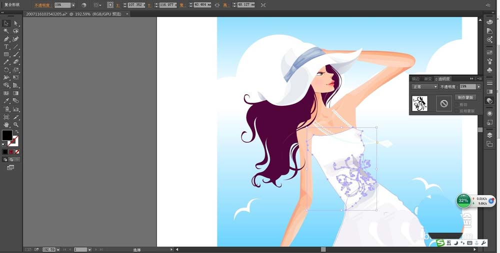 5、继续画出女子的白裙子的路径,我们用灰白色与白色搭配填充。裙子上面的花纹用灰黑色填充,再设置透明度到19%左右。