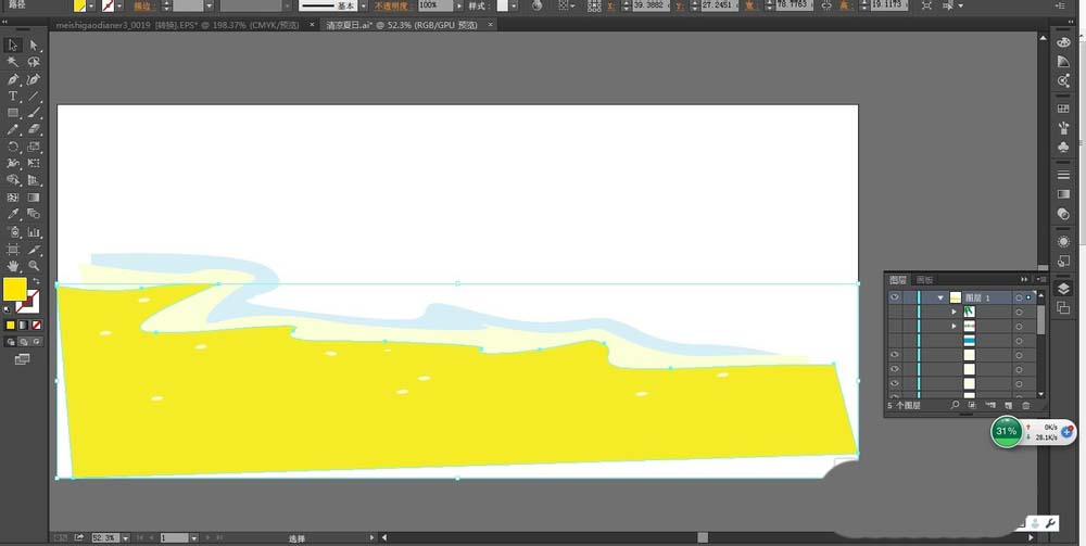 2、我们用黄色填充这个沙滩轮廓路径,用白色来填充一些石子的路径,水流用天蓝色来填充。