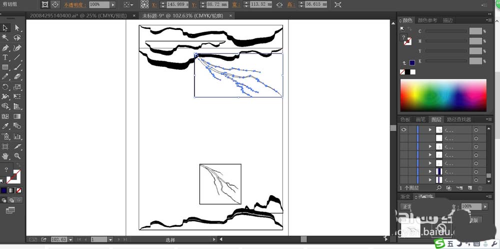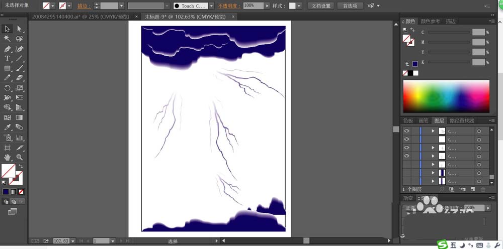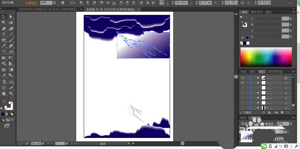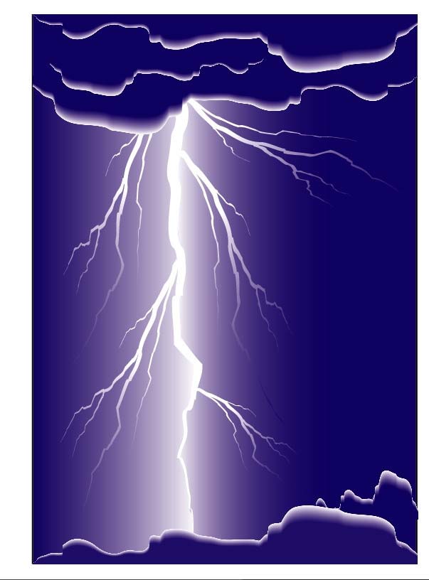4、我们用树形闪电的路径与蓝色的渐变矩形做剪切蒙版,从而有了蓝白色的闪电。