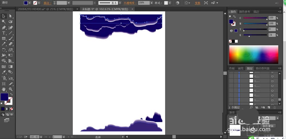 2、我们用蓝色到白色的渐变填充上方的云层,用白色到蓝色的渐变填充下方的云层。