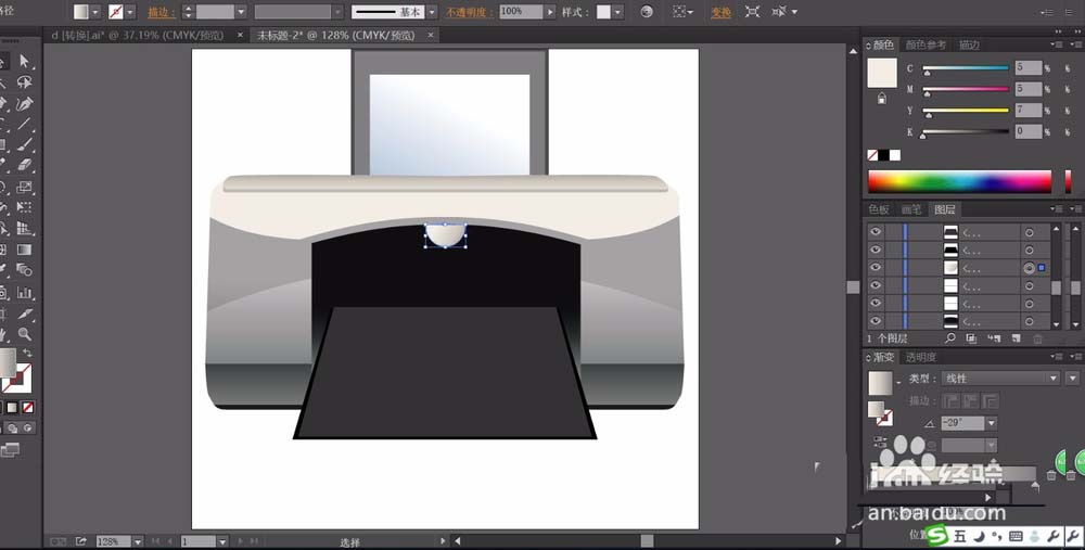 5、画出打印机的顶端细节元素的路径,我们用米白色的渐变填充顶端结构件,再画出打印机的出纸口的路径,我们用灰黑色的渐变填充。