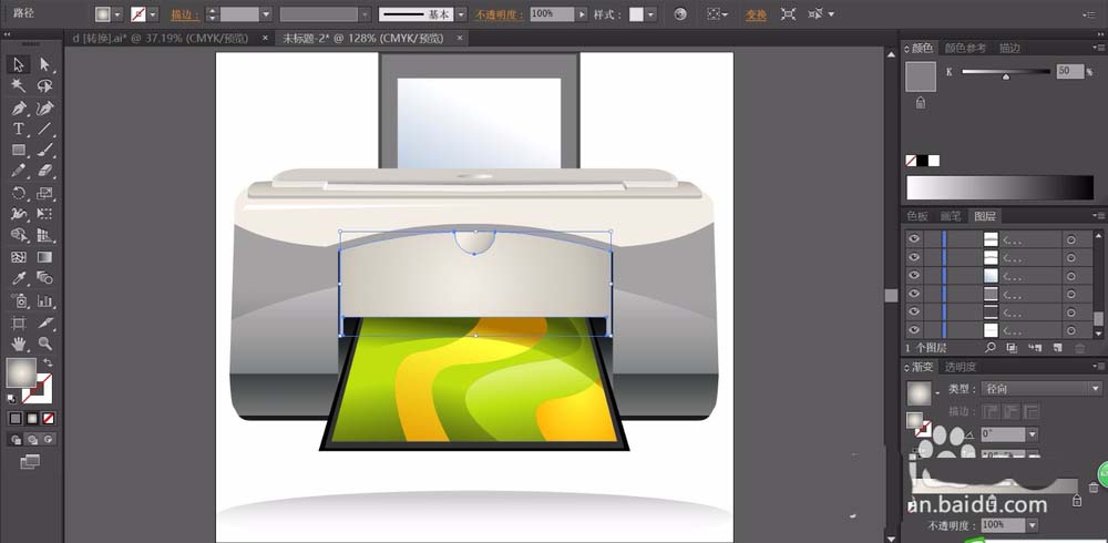 4、使用钢笔画出打印机的中间翻盖的路径并用灰黑色的渐变填充。