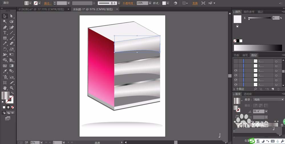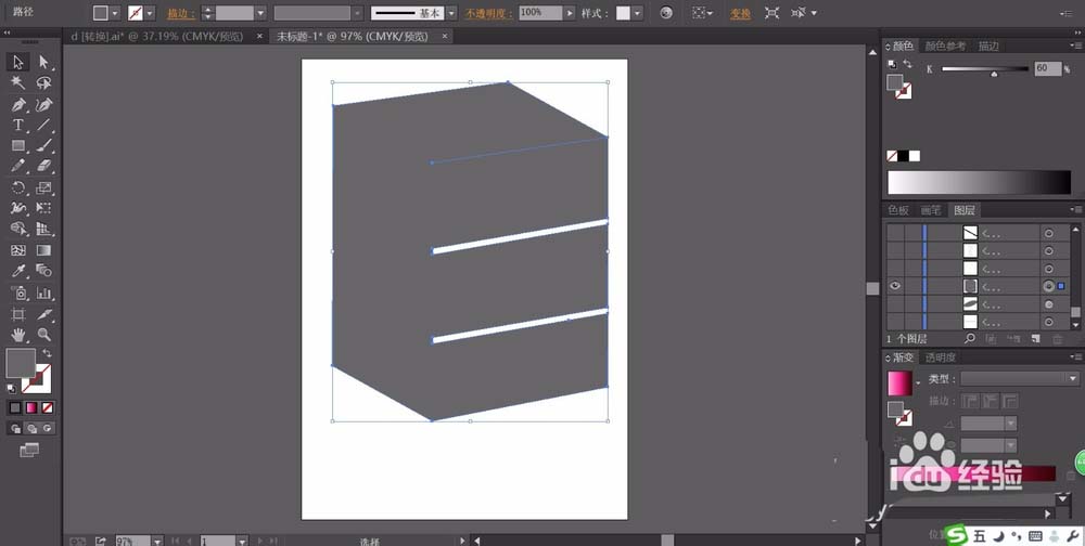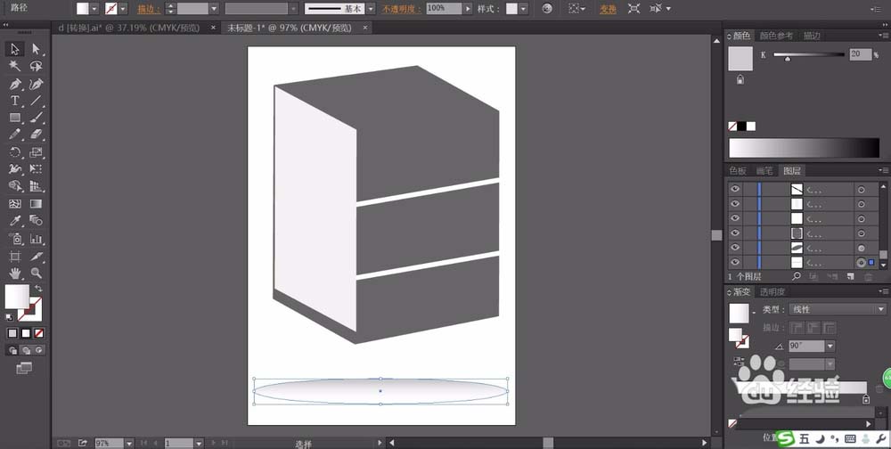 2、用钢笔画出床头柜的左侧面的路径,我们先用灰白的渐变填充。