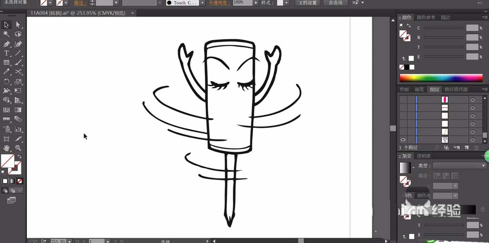 1、先来用钢笔画出工具的动作与表情,我们用长长的眉毛来呈现工具美丽的表情,再用双手举起的动作来呈现一个舞蹈的感觉,接着,我们画出工具周围的风儿的路径。