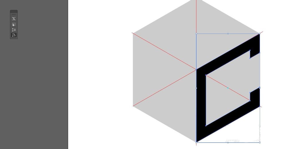 2、这里用字母C来演示,如图,将字母放置好,选择自由扭曲工具使其倾斜,也可以用变换或倾斜工具,330度倾斜