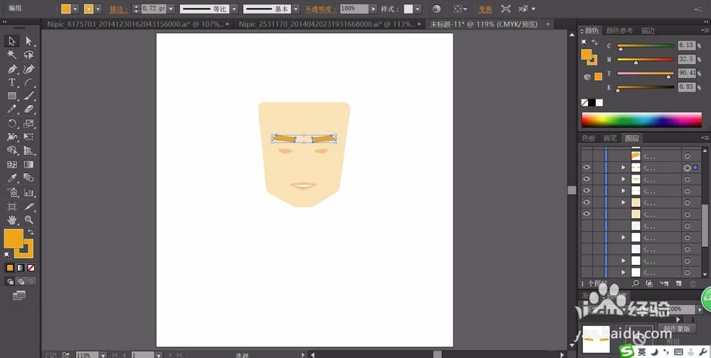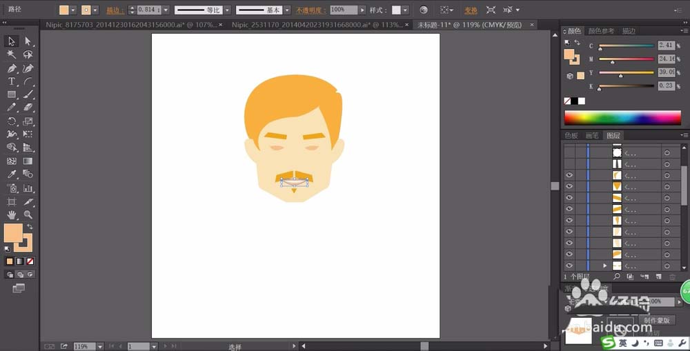 3、继续绘制人物的头发与胡子等表情的细节元素路径,我们用橙黄色填充头发,嘴唇用粉色来填充。