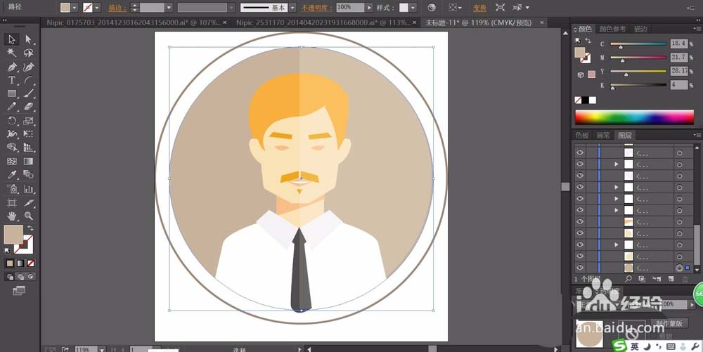 7、使用圆形工具画出一个正圆形在老师的头像的下面,我们用棕灰色填充,完成男老师头像设计。