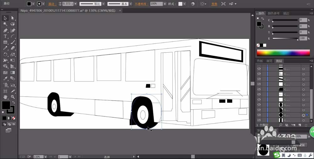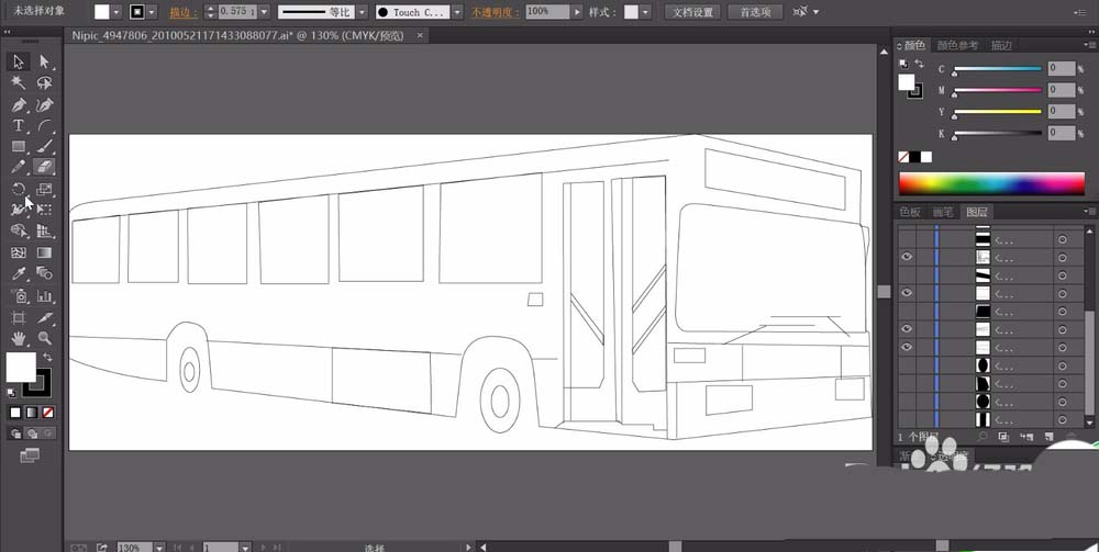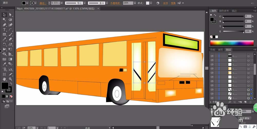 1、使用矩形工具与钢笔工具画出公交车的基本形状,我们主要画出车体、车窗、车门、车灯等所有的必要元素的封闭路径。