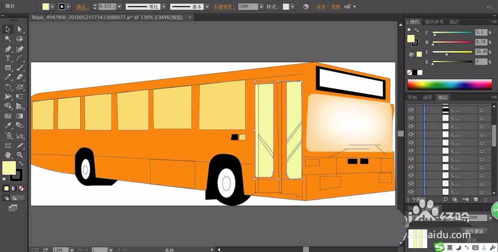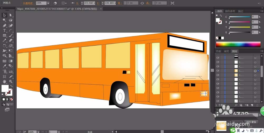 5、使用橙黄色填充公交车的左侧所有的窗玻璃,再有黄色填充车门的玻璃路径,我们用网格工具做出黄色到白色的渐变效果。