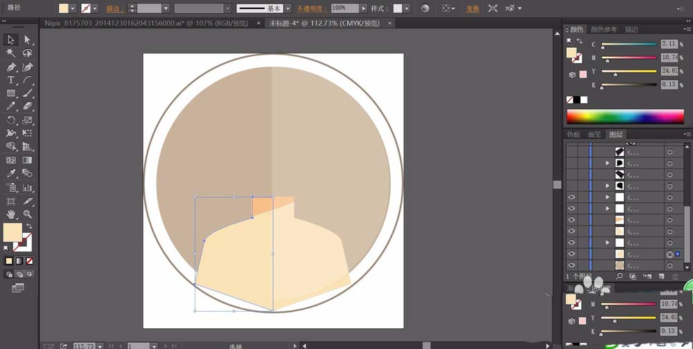 3、我们画出大叔的身体与脖子的路径,我们填充一个土黄色,在脖子上方左侧用橙色来填充,让这里成为暗区路径。